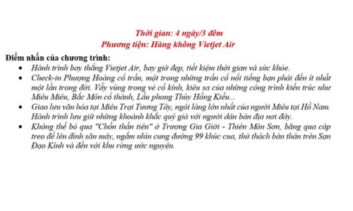 Trưa: Bữa trưa sẽ được thưởng thức tại nhà hàng trước khi tiếp tục hành trình tham quan Hồ Bảo Phong trong khu thắng cảnh Vũ Lăng Nguyên khám phá trương gia giới. Tại đây, quý khách sẽ được trải nghiệm đường thuyền trên Hồ Trên Núi với "Dao Trì Nhân Gian" như hình thức hát đối Quan Họ Bắc Ninh và thả thuyền trên hồ Bảo Phong, cơ hội ngắm nhìn phong cảnh hữu tình của rặng núi xanh ngắt và thác nước trắng muốt từ sườn núi.